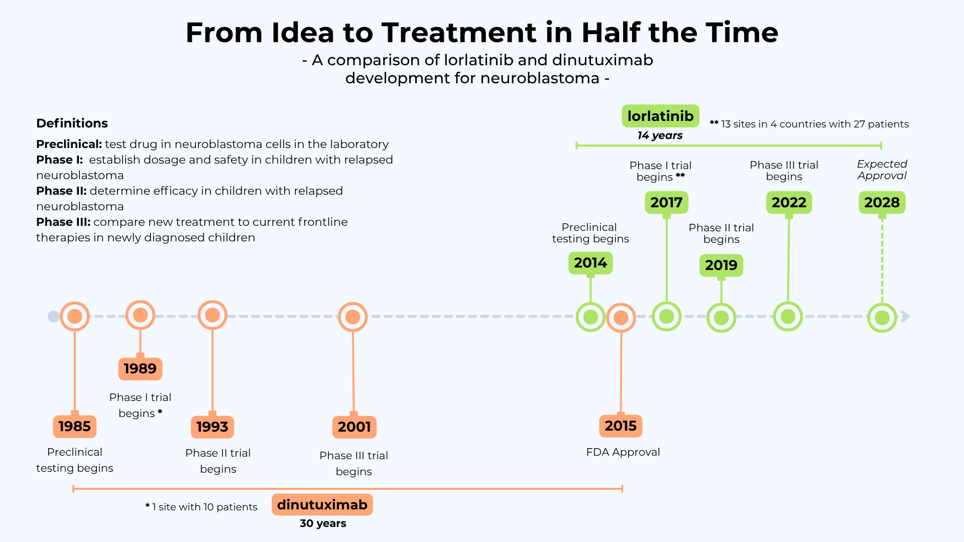 New Approaches to Neuroblastoma Therapy (NANT) consortium opened this Phase I trial in 2017 at 13 sites in 4 countries, including sites in London and Paris. This was accomplished remarkably fast, within two years of the initial lab results. For children, that kind of speed and access is critical.